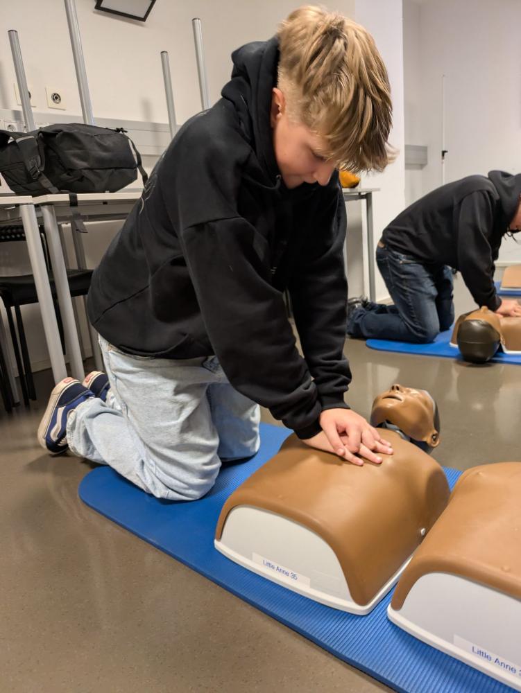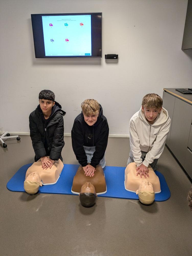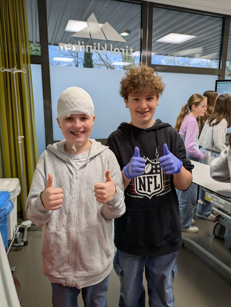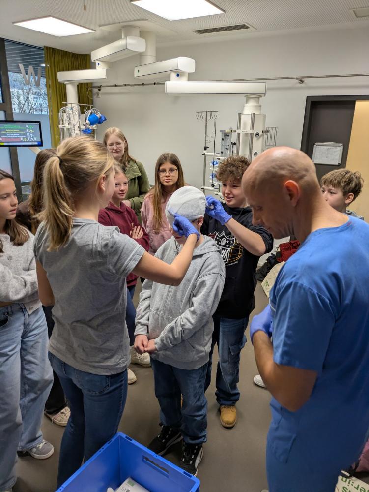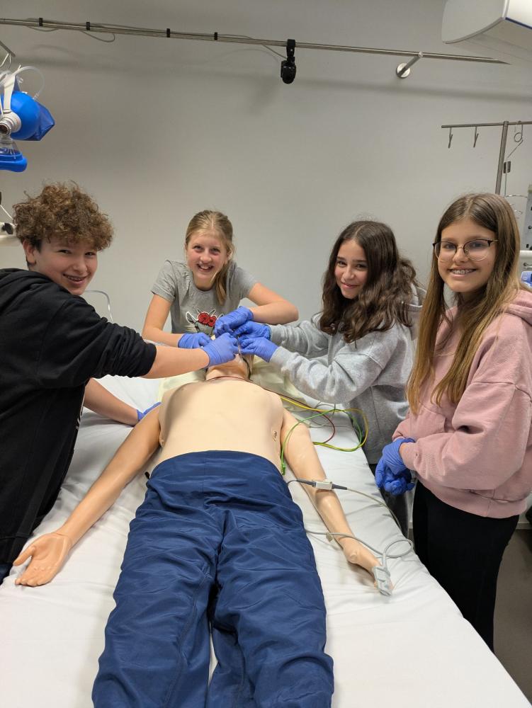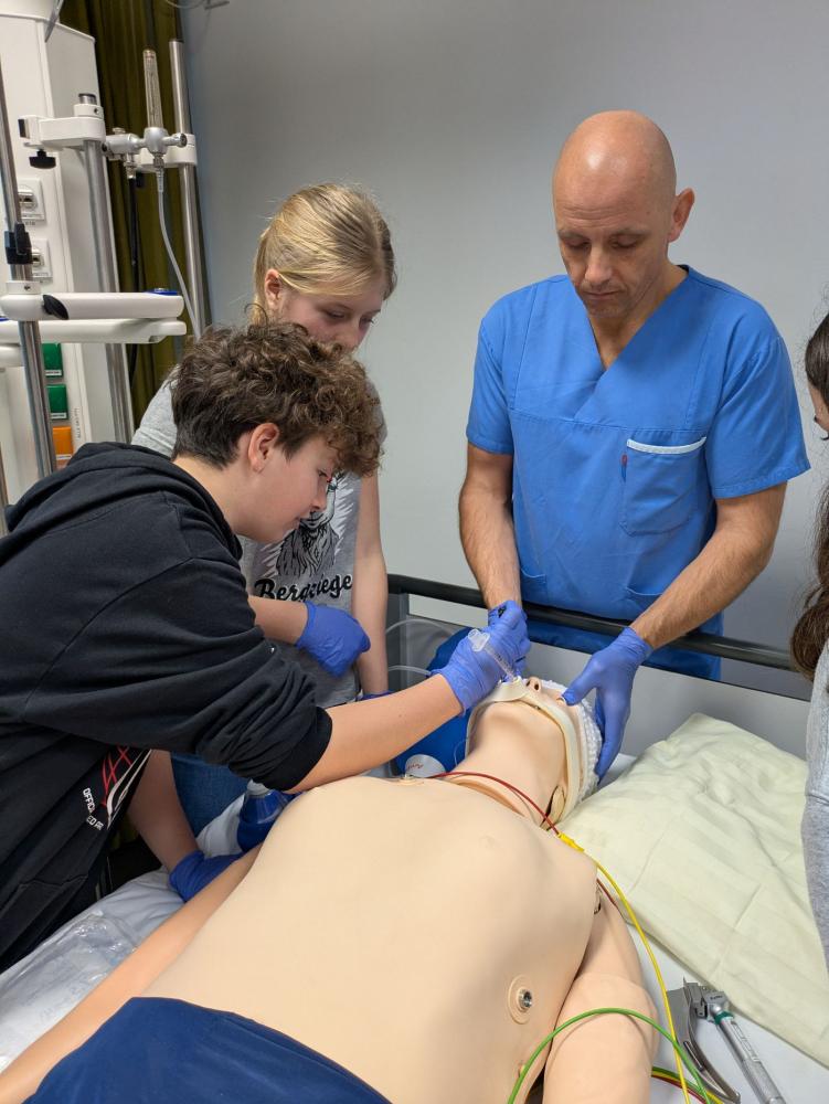 Ergänzend dazu stellten die Schüler:innen in einer realitätsnahen Simulation ihr Teamwork unter Beweis: In einer kritischen Notfallsituation nach einem Fahrradsturz bearbeiteten sie an verschiedenen Stationen wichtige Aufgaben, darunter die Überprüfung der Pupillenreaktion in der Pflege sowie die Auswertung von Laborwerten. Der Besuch unterstützte die berufliche Orientierung unserer Jugendlichen und zeigte vielfältige Zukunftsperspektiven im Gesundheitsbereich auf.